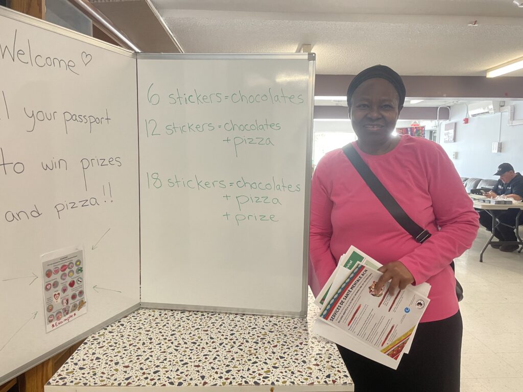 Euphrasie Emedi, membre du cercle des locataires de Manoir Heather, a expliqué le fonctionnement du système de passeport lors du salon des ressources. Les locataires qui visitaient tous les stands d’information avaient la possibilité de gagner des pizzas, du chocolat et d’autres prix.