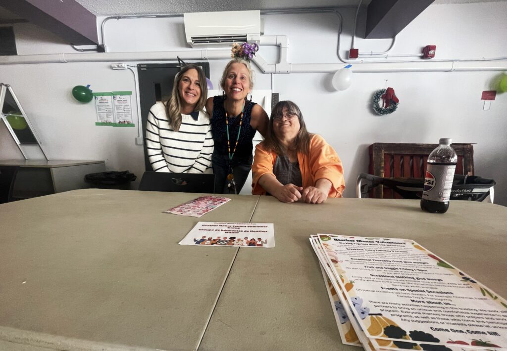De gauche à droite : Amanda Ryan, responsable du développement communautaire, Yolanda Jones, responsable du développement communautaire, et Lynn, membre du Heather Manor Tenant Circle, photographiées lors du salon des ressources.
