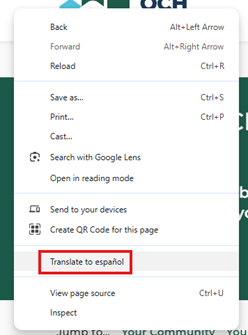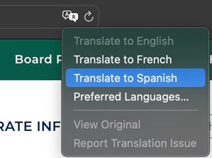 If Chrome does not automatically prompt to translate and/or the translate icon does not display in the URL bar, right click anywhere on the page and choose ‘Translate to …’